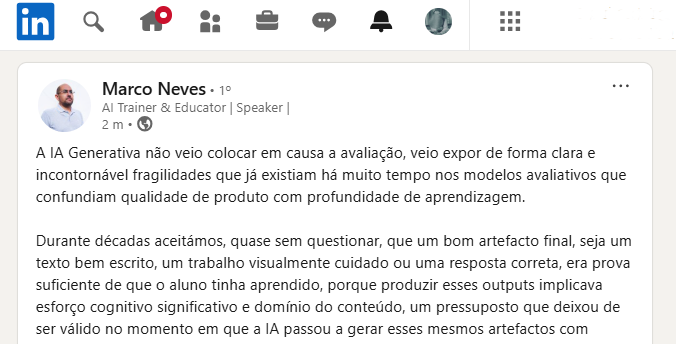O que defende ? Destaca a ideia de que a IA não está a comprometer a avaliação, mas sim a revelar fragilidades que sempre existiram nos modelos tradicionais. Argumenta que, durante décadas, a qualidade do produto final (como um texto bem escrito ou uma resposta correta) foi tomada como evidência suficiente de aprendizagem. Contudo, com a capacidade atual da IA para gerar esses mesmos resultados com rapidez e qualidade aparente, esse pressuposto deixa de ser sustentável. O foco desloca-se, assim, do produto final para o processo. O post sublinha que o problema não é tecnológico, mas pedagógico, questionando o que se entende por conhecimento e como este se torna visível. Neste novo cenário, a avaliação baseada exclusivamente em resultados revela-se insuficiente, exigindo modelos que valorizem o raciocínio, a compreensão e a capacidade crítica dos estudantes.