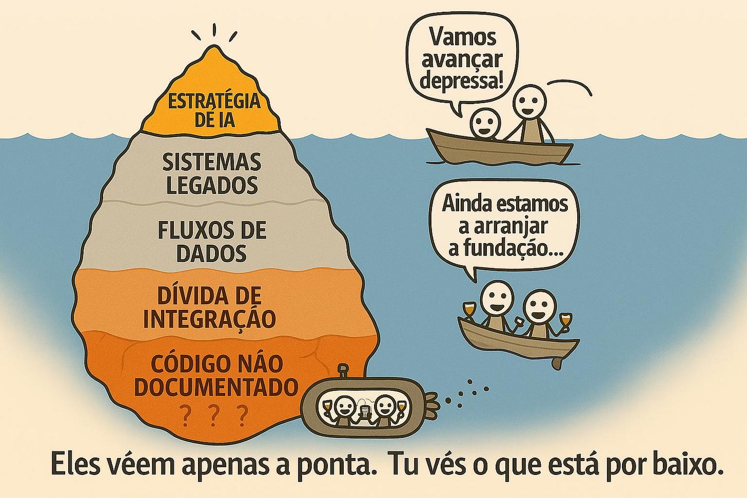 O que mostra? A metáfora do icebergue, aplicada aos projetos de IA, revela uma assimetria recorrente entre o visível e o estrutural. Na superfície, concentram-se narrativas de inovação, estratégias ambiciosas e entusiasmo tecnológico. Contudo, na base submersa, frequentemente negligenciada, existe um esforço árduo. Esta lógica é particularmente elucidativa quando transposta para o campo educativo. À vista surgem indicadores como resultados, rankings ou discursos sobre modernização digital, enquanto permanecem ocultas as infraestruturas pedagógicas e organizacionais que sustentam o sistema. A metáfora evidencia, assim, que a complexidade da transformação educativa não reside nas iniciativas visíveis, mas nas condições estruturais, frequentemente invisíveis, que as tornam possíveis.