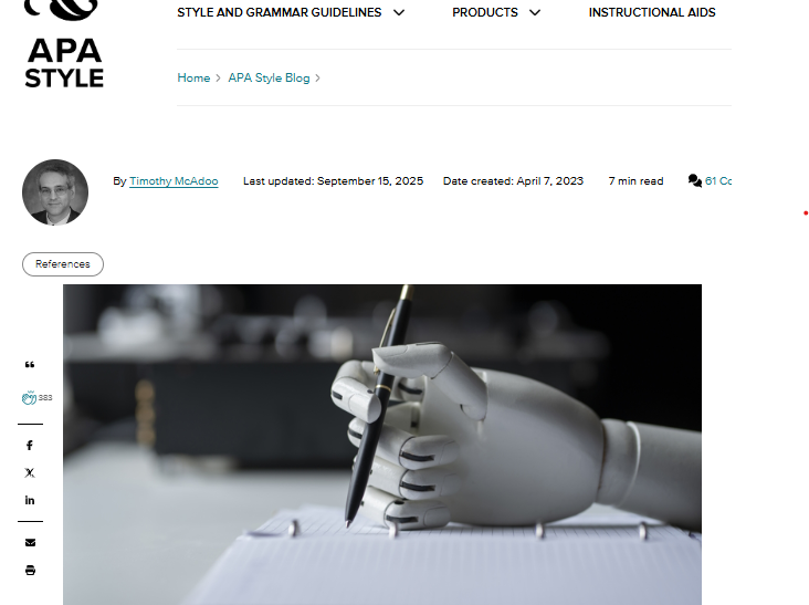 O que diz ? Apresenta um guia atualizado sobre a utilização ética e a citação de ferramentas de IA segundo as normas da APA. O autor sintetiza recomendações recentes que distinguem diferentes usos da IA no trabalho académico. Enfatiza, ainda, que a IA não pode ser considerada autora e que a responsabilidade científica permanece integralmente do investigador. Trata-se de um recurso prático que articula normas técnicas com princípios éticos fundamentais.